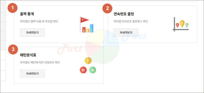 번호에도 홀짝이 있죠. 이러한 홀짝의 비율과 번호합의 확인, 회차별 연속으로 추첨된 번호의 출현 횟수 확인, 회차별 패턴 확인도 할 수 있고요.