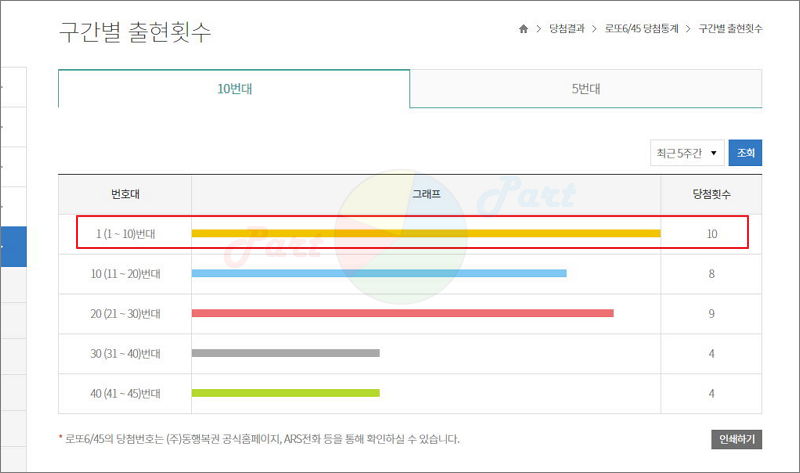 구간별 출현횟수를 통해 최근 5주간 많이 나온 로또 번호의 구간도 알 수 있어요. 1번에서 10번대가 최근 5주간 가장 많이 당첨 되었었네요.