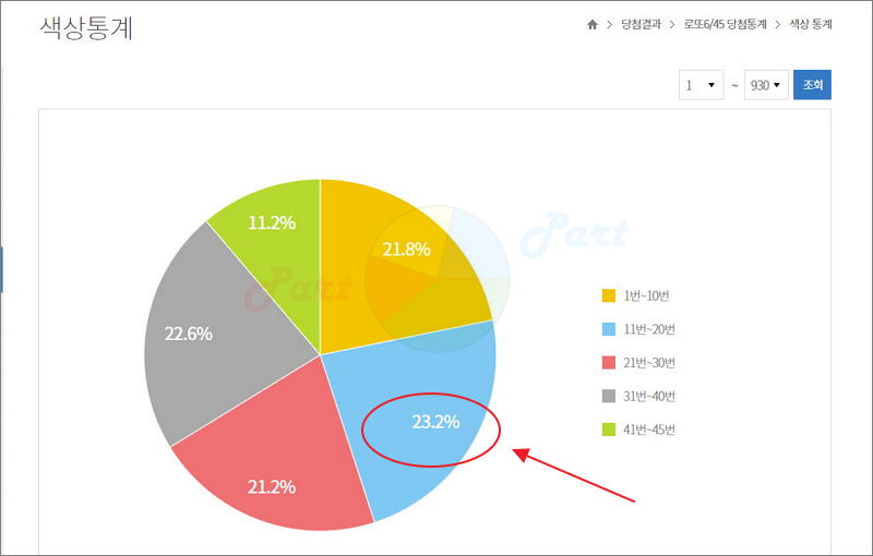번호를 10단위로 구분하여 어느 부근에 많이 나왔는지도 알 수 있어요. 색상 통계를 보아하니 1회부터 930까지 11번에서 20번 사이가 가장 많이 나왔었네요. 이와 반대로 41번에서 45번이 가장 적게 나왔었고요.