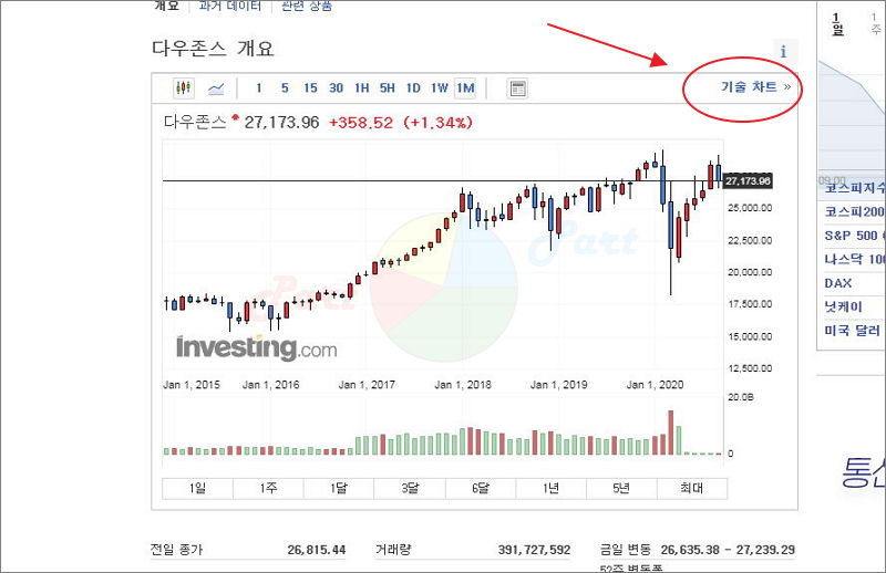 다우존스 지수도 차트를 통해 확인이 가능해요. 월봉을 보면 아시겠지만, 최근에 급락했다가 다시 상승했어요.