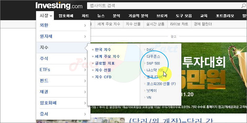 사이트에서 메뉴를 보면 아시겠지만, 웬만한 금융 상품을 대부분 다루고 있어요. 메뉴에서 [시장]과 [지수]를 순서대로 클릭해 보세요. 그럼 우리가 찾던 다우존스 지수와 나스닥 지수가 나와요. 이와 함께 같이 많이 보는 S&P 500도 있고요.