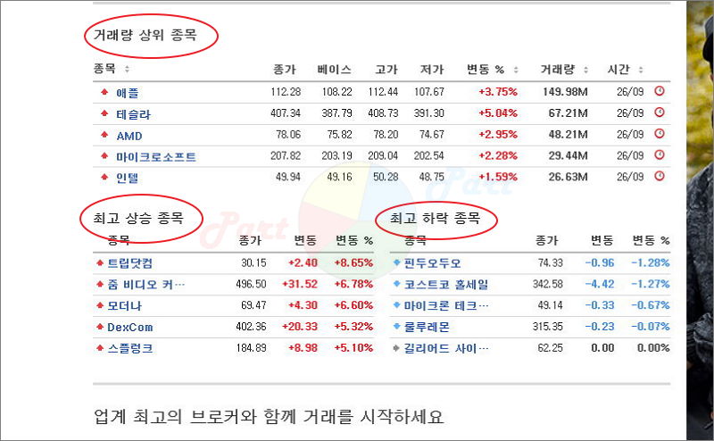 나스닥에 포함된 종목의 주가도 확인이 가능해요. 거래량 상위 종목, 최고 상승 종목, 최고 하락 종목이 보이네요.