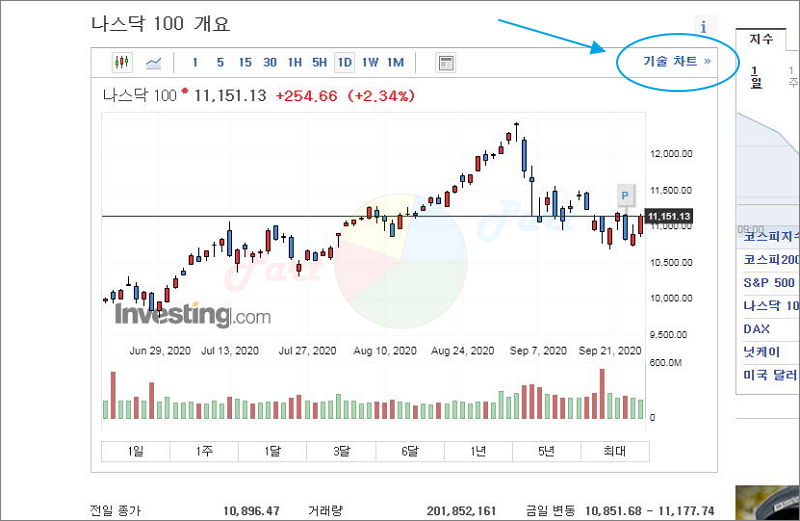1분 봉에서부터 월봉까지 선택이 가능하고요. 차트를 통해 나스닥 지수를 예측하고 싶다면 기술 차트를 이용해 보세요. 여러 가지 이용할만한 도구가 많아요.