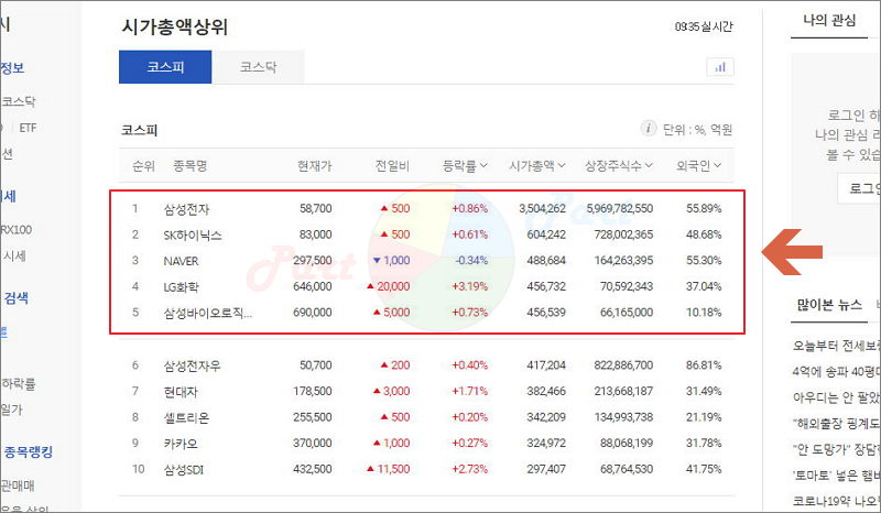 코스피 상위 종목의 경우에는 시가총액의 순위가 쉽게 변하지는 않아요.