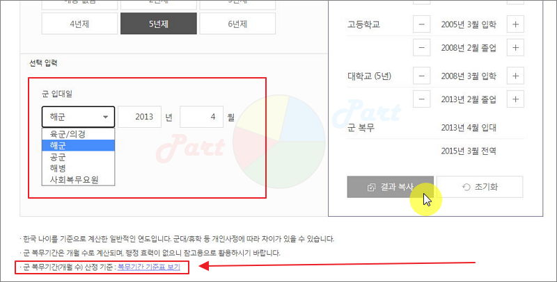 해당 버튼을 누르면 기준년도와 군대의 종류에 따라 군 복무기간이 얼마나 되는지 확인할 수 있으니 참고해 주세요.