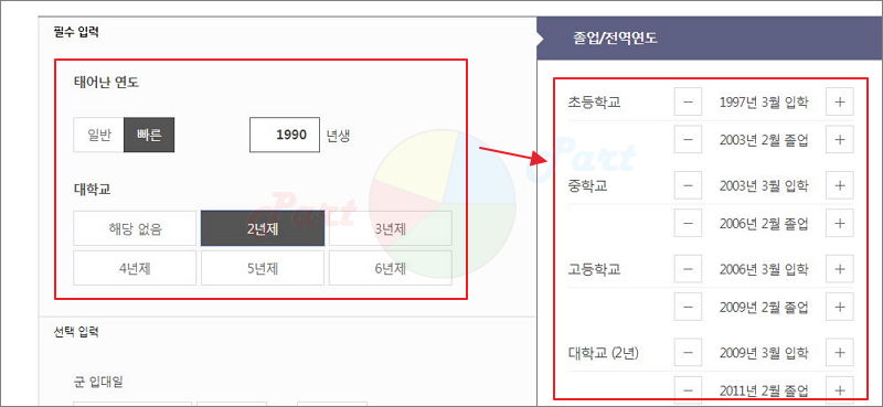 생일이 빠른인 경우에도 설정이 가능하고요. 대학교는 해당 없음에서 6년제까지 선택할 수 있어요.