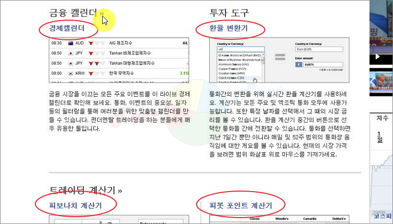 경제 캘린더, 환율 변환기, 피보나치 계산기, 피봇 포인트 계산기 등이 있죠.