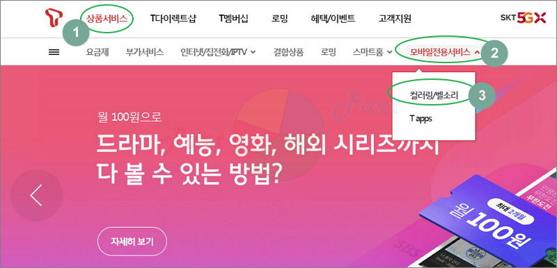 거기에서 모바일 전용 서비스를 선택하면 [컬러링/벨소리] 버튼을 찾을 수 있어요.