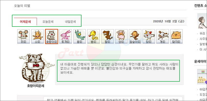 자신의 띠를 선택하면 어제, 오늘, 내일의 운세에 대한 풀이가 바로 나와요.