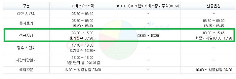 보통 많은 분들이 주식 매매에 참여하는 때는 정규시장이 열리는 9시부터 15시 30분 사이에요.