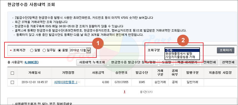 조회 구분에서는 현금매출명세서 발생과 사업자 지출증빙용 거래 둘 중에 하나를 선택해 주시고요.