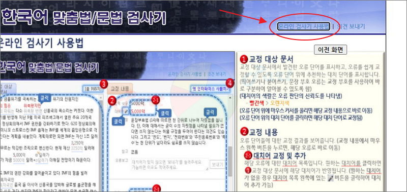 온라인 맞춤법 검사 프로그램의 우측 상단을 보면 제작사에서 제공하는 사용법을 읽어볼 수 있어요.