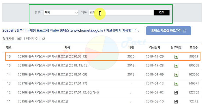 ▲ 2020년 귀속 퇴직소득 세액계산 프로그램 클릭