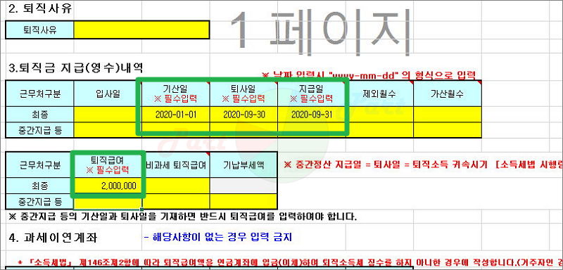 몇 가지 항목만 정확하게 입력하면 퇴직금 세금이 자동으로 계산되도록 되어 있어요.