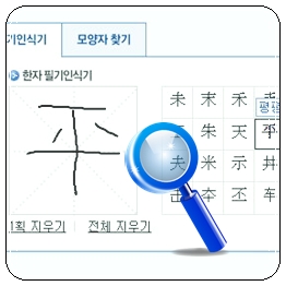 ▲ 네이버 한자사전 사이트에 접속했습니다. 우측에 보면 한자 필기인식기가 있습니다. 여기에 마우스로 한자를 그리면 됩니다. 모양자로 이용하여 찾을 수도 있는데, 아무래도 한문에 대해 잘 모르면 사용하기 어렵습니다. 어느 정도 한문을 아시는 경우 사용하면 좋습니다.