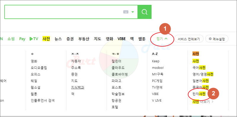 ▲ 네이버 메인화면 입니다. 메뉴를 보면 사전, 뉴스, 부동산 등 여러 가지가 있습니다. [더보기] 버튼을 누릅니다. 그럼 맨 오른쪽에 사전이 모여 있습니다. 이 중에서 한자사전을 클릭합니다.