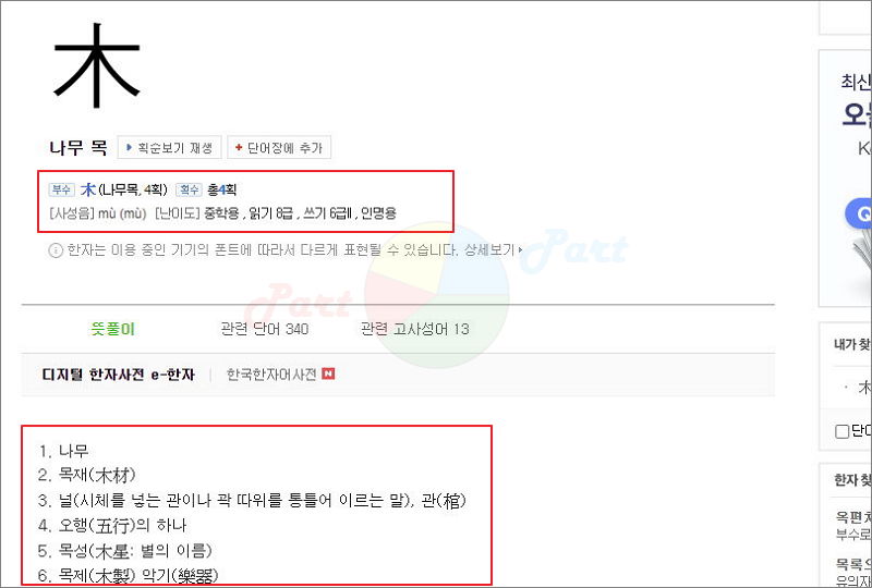 ▲ 같은 뜻을 가진 유의자나 관련 단어도 추가로 알아볼 수 있습니다. 나무 목이 포함된 단어를 340건이나 살펴볼 수 있습니다. 다음에 한자 그리기를 할 때 도움이 되는 획순도 배울 수 있으니 참고하시길 바랍니다.