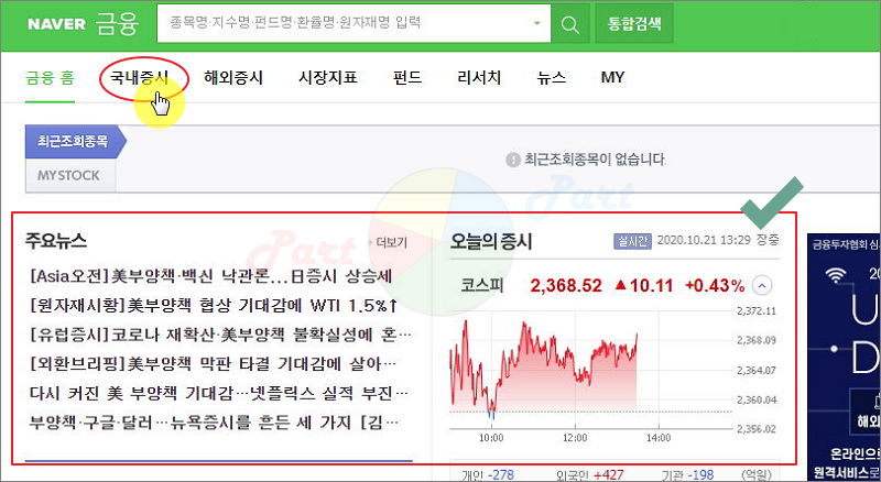 ▼ 네이버 금융 사이트에서는 국내외 증시에 관한 정보와 서비스를 제공하고 있습니다. 경제에 관련된 주요뉴스나 오늘의 증시를 살펴보기에 적합한 곳입니다. 배당금에 관련된 자료는 메뉴에서 [국내증시]를 클릭하면 나옵니다.