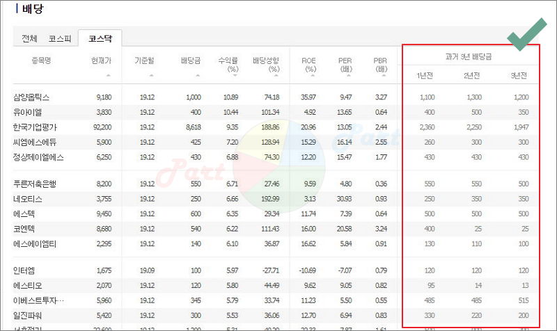 ▼ 앞서 살펴본 배당금 높은 주식 리스트입니다. 리스트 상단에 있는 탭을 클릭하면 코스피 또는 코스닥 종목만 살펴볼 수도 있습니다. 해당 리스트에서 주의깊게 살펴봐야 하는 부분은 배당금, 수익률, 과거 3년 배당금입니다. 아무래도 지속적으로 배당을 해주는 기업일수록 올해에도 빠짐 없이 배당금을 지급할 가능성이 높습니다.