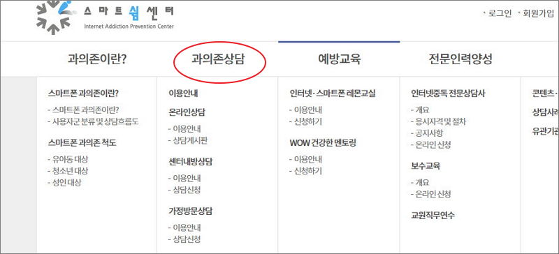 ▼ 해당 사이트를 통해 과의존상담을 받거나 예방교육 신청을 할 수 있습니다. 스마트폰 중독 테스트를 받거나 상담을 받아보는 것부터 시작하면 됩니다.