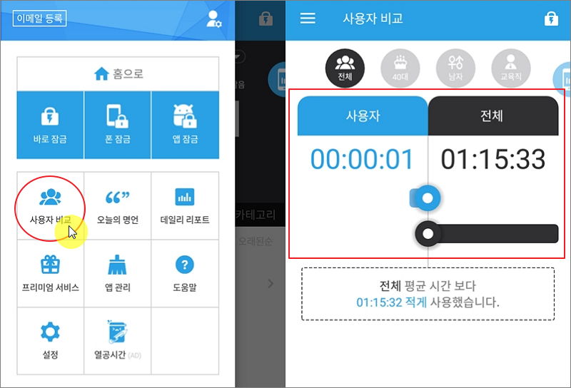▼ 좌측 상단에 있는 버튼을 클릭하면 전체 메뉴가 나타납니다. 사용자 비교를 통해 다른 사람보다 내가 얼마나 스마트폰을 많이 사용하는지 알 수 있습니다. 이를 통해 자신이 정말 스마트폰 중독인지 여부도 확인할 수 있습니다.