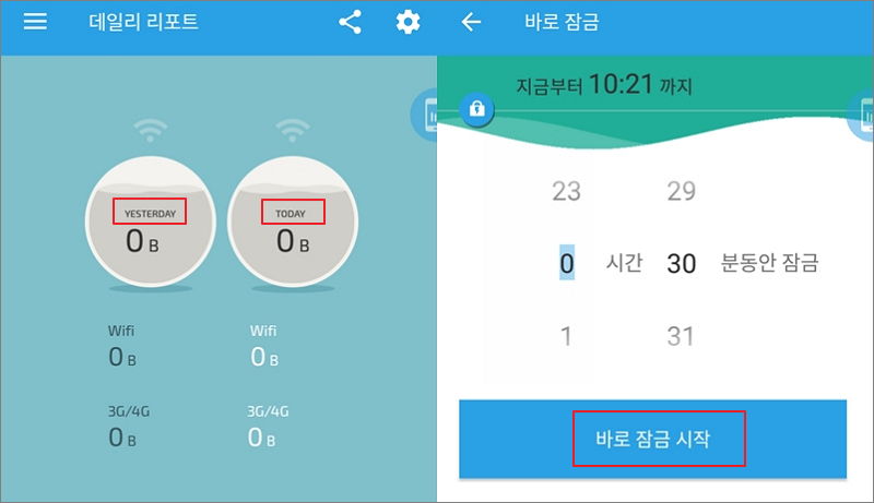 ▼ 어제와 오늘 데이터를 얼마나 사용했는지도 알아볼 수 있습니다. 특정 시간 동안 스마트폰을 사용하는 것을 막으려면 바로 잠금 기능을 사용하면 됩니다. 그럼 유혹을 뿌리치지 못하는 것을 예방할 수 있습니다.