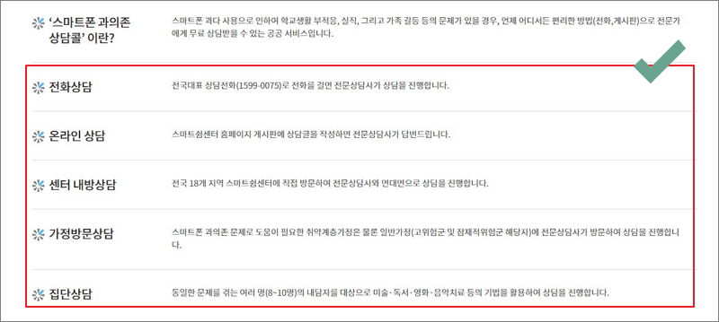 전화, 온라인을 통해 상담도 가능하고, 센터에 내방하거나 가정방문을 통해 상담을 받을 수 있습니다. 전문가의 도움을 받으면 스마트폰 중독에 대한 예방에 효과적일 것이라고 생각합니다.