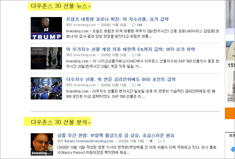 ▼ 다우존스 30 선물지수에 관련된 뉴스나 분석 내용도 확인이 가능합니다. 아무래도 인베스팅이 해외 제작사에서 만들어졌기 때문에 해외 뉴스에 대한 내용이 괜찮을 것이라고 생각합니다. 뉴욕 거래소에 대한 분위기를 파악하는 데에 이러한 정보 확인은 필수입니다.