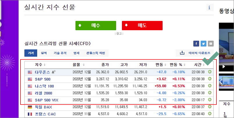 시차가 있기 때문에 미국 증권거래소가 열릴 때 우리나라 주식시장을 거래가 끝난 상태입니다. 하지만 뉴욕증시 선물 지수의 경우 국내 주식시장이 열린 상태에서도 확인이 가능합니다. 그렇기 때문에 주식투자를 할 때 참고 지표로 활용하는 사람들이 많습니다. 최근에는 국내 코스피 및 코스닥 지수와 유사한 흐름을 보이고 있어서 저 또한 많이 참고하고 있습니다.
