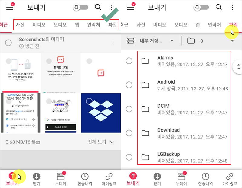▼ 본격적으로 어플 사용 방법을 알려드리겠습니다. 화면에서 좌측 하단에 있는 보내기 버튼을 터치해 봅니다. 그럼 여러 파일을 선택할 수 있도록 되어 있습니다. 백업하고 싶은 파일을 선택합니다. 사진, 비디오, 오디오, 앱, 연락처 외의 파일도 백업이 가능합니다. 메뉴에서 파일을 선택하면 스마트폰의 내부 저장소 또는 외부 저장소에 접근이 가능합니다. 저장하고 싶은 폴더나 파일을 선택할 수 있습니다.