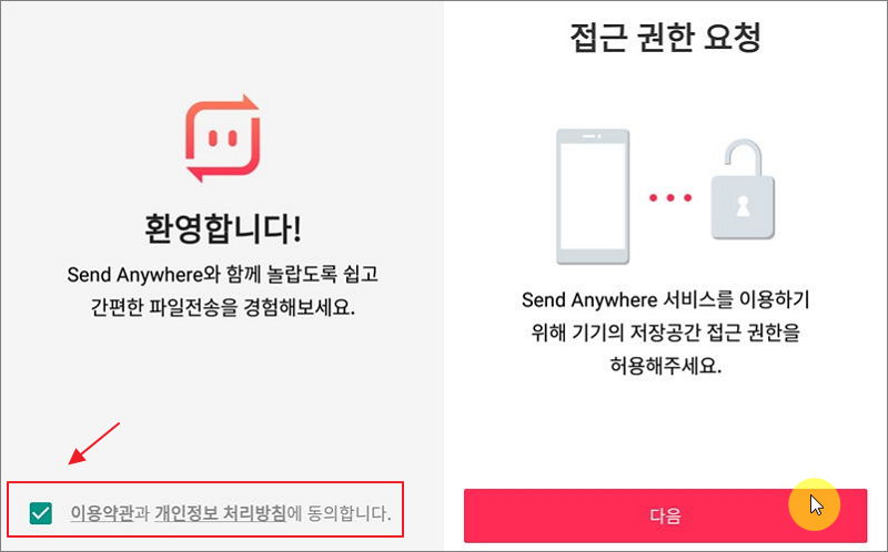 ▼ 방금 설치한 Send Anywhere를 실행해보았습니다. 처음 실행하는 경우에는 스마트폰 저장공간에 대한 접근 권한을 허용해야 합니다. 그래야 스마트폰 내부 곳곳에 있는 파일을 백업할 수 있습니다.