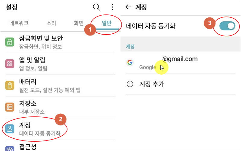 ▼ 이번에는 자동으로 백업을 하는 방법을 알려드리겠습니다. 일부 파일에 대해서는 데이터 자동 동기화가 가능합니다. 스마트폰에서 설정 어플리케이션을 실행합니다. 일반 탭에 터치한 후 "계정" 서비스를 터치합니다. 새롭게 열린 화면에서 "데이터 자동 동기화"를 체크합니다.