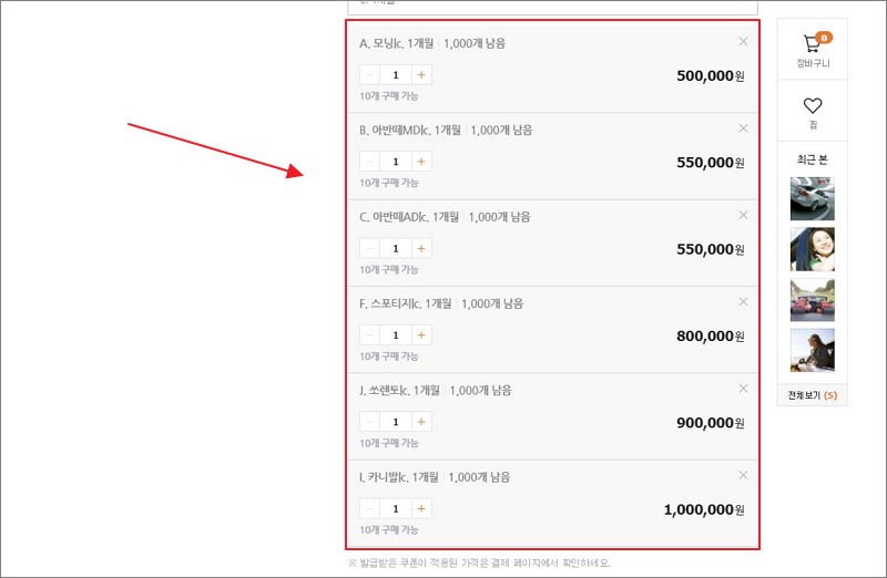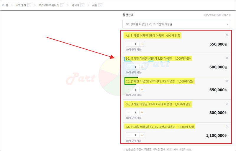 ▼ 다른 판매자의 자동차 렌트 가격표를 살펴보겠습니다. 여기서는 레이와 비슷한 급인 모닝을 선택할 수 있습니다 .한달에 50만원으로 꽤 저렴한 편입니다. 많은 사람이 탈 수 있고, 다용도로 사용하기에 좋은 카니발도 있습니다. 해당 자동차를 렌트하는 경우 한달 기준 100만원의 비용이 발생합니다.