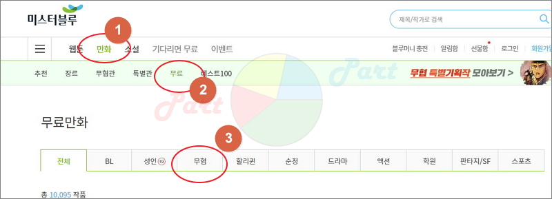 ▼ 메뉴에서 만화를 클릭해 봅니다. 그럼 추천, 장르, 무협관, 특별관, 무료, 베스트100 이렇게 6가지 메뉴가 나타납니다. 여기에서 무료를 클릭해보면 미스터블루에서 공짜로 볼 수 있는 작품이 나옵니다. 총 10,095개나 되는 것을 확인할 수 있습니다.