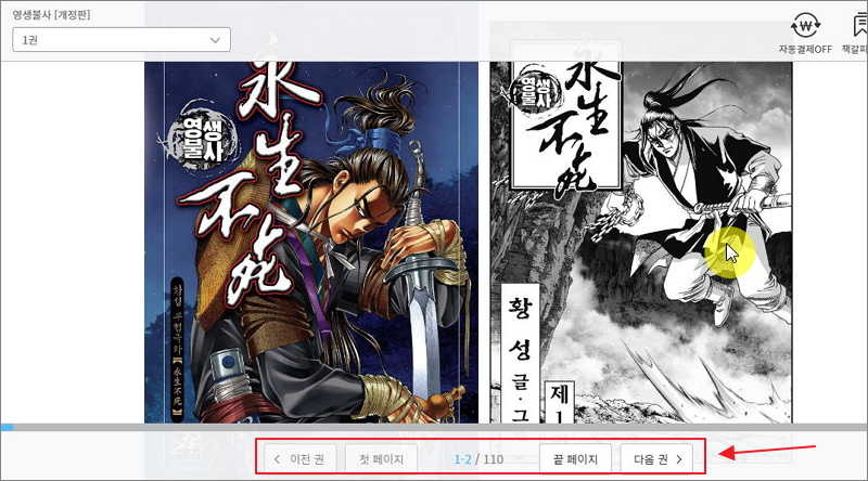 ▼ 보고 싶은 작품 중 하나인 황성 작가의 영생불사를 클릭해 보았습니다. 마우스를 클릭하면 작품을 바로 감상할 수 있는 페이지가 열립니다. 감상 화면은 2개의 페이지로 구성이 되는데, 우측 페이지를 클릭하면 넘길 수 있습니다. 정중앙을 클릭하면 여러 메뉴가 나타나오니 참고하시길 바랍니다.