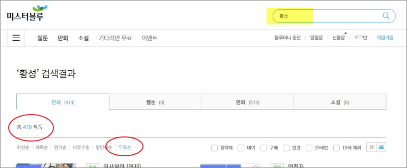 ▼ 미스터블루 사이트에서 찾아볼 수 있는 황성 작가의 만화는 총 479개나 됩니다. 사이트 화면에서 우측 상단에 위치한 검색창을 이용하면 쉽게 찾을 수 있습니다. 무료 작품 위주로 작품 리스트를 정렬하고 싶다면 리스트 상단에 있는 소메뉴에서 무료순을 클릭하면 됩니다.