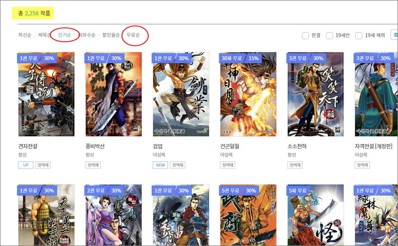 ▼ 무협 만화의 경우에는 2,258개의 작품에 대하여 무료 감상이 가능합니다. 인기순으로 살펴보니 황성 작가의 견자전설, 풍비박산, 소소천하가 높은 인기를 자랑하고 있음을 알 수 있습니다.