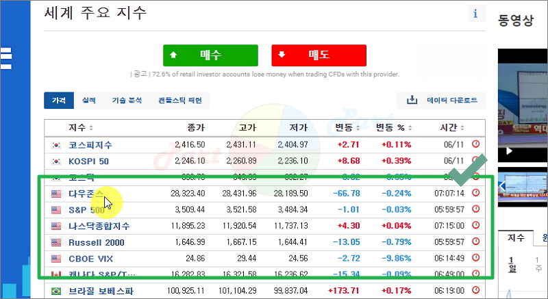 ▼ 세계 주요 지수 페이지가 열렸습니다. 이곳에서는 여러 나라의 지수에 대한 가격, 실적, 기술 분석, 캔들스틱 패턴 정보를 살펴볼 수 있습니다. 표를 살펴보면 미국의 지수로 다운존스, S&P 500, 나스닥 종합지수, Russell 2000, CBOE VIX 이렇게 5개 지수가 보입니다. 시세의 경우 실시간으로 반영되는 것이기 떄문에 뉴욕증시가 열린 상태라면 관련 숫자가 변하는 것을 확인할 수 있을 겁니다.