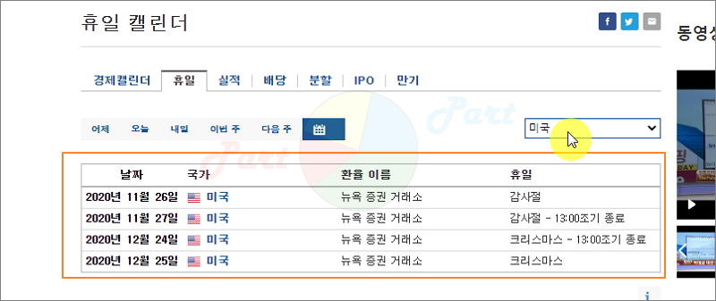 ▼ 휴일 캘린더를 통해 미국의 뉴욕증시는 물론이고, 세계 각국의 휴일을 알 수 있습니다. 뉴욕 증권 거래소의 경우 11월 26일에서 27일까지는 감사절이고, 12월 24일부터 25일은 크리스마스로 인하여 주식시장이 열리지 않는다는 것을 확인할 수 있습니다. 이런 식으로 다우지수에 대한 정보를 얻거나 뉴욕증시에 대한 휴일 일정을 미리 알아볼 수 있습니다.