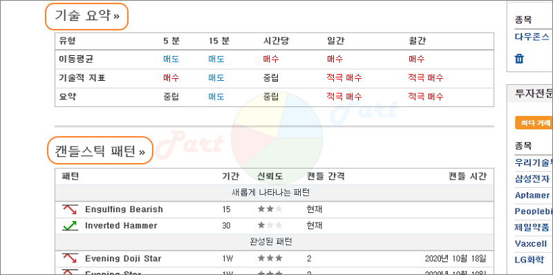 ▼ 다우지수에 대한 기술 요약과 캔들스틱 패턴 결과를 확인할 수 있습니다. 매매 타이밍을 정할 떄 참고하면 좋을 것 같습니다.