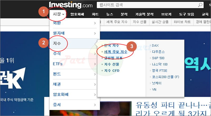 ▼ 인베스팅 사이트에서 다우지수에 대한 정보를 찾는 것은 간단합니다. 메뉴에서 "시장"과 "지수"를 클릭하면 관련 메뉴가 나타납니다. 다우지수를 포함한 미국의 모든 지수를 살펴보려면 "세계 주요 지수"를 선택하는 것이 좋습니다.