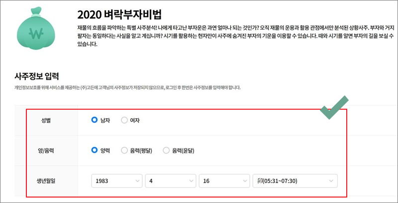 ▼ 이번 포스팅에서는 온라인 사주 서비스 중에서 경제에 관련된 것을 이용해 보겠습니다. 삼성생명 사이트의 "2020 벼락부자비법"입니다. 올해에 재물운은 물론이고, 투자를 할 때 참고한 수 있는 운을 알아볼 수 있습니다. 해당 서비스를 이용하려면 사주정보를 정확하게 입력해야 합니다. 태어난 시각까지 꼼꼼히 입력해야 사주풀이 결과가 정확하게 나옵니다.
