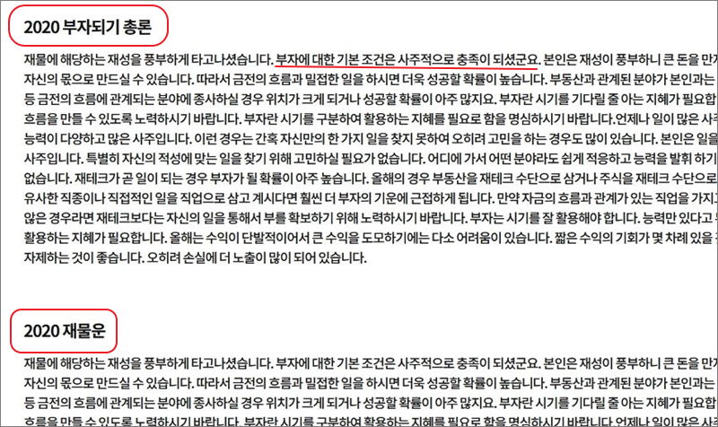 ▼ 2020 부자되기 총론이 나왔습니다. 다른 사주 사이트와 다르게 해석의 내용이 굉장히 풍부한 편입니다. 올해 어떤 수익 또는 손실이 발생하는 지에 대해 이야기 하고 있습니다. 부자에 대한 기본 조건이 사주적으로 충족 되었는지 재물운 해석을 통해 알아볼 수도 있습니다.