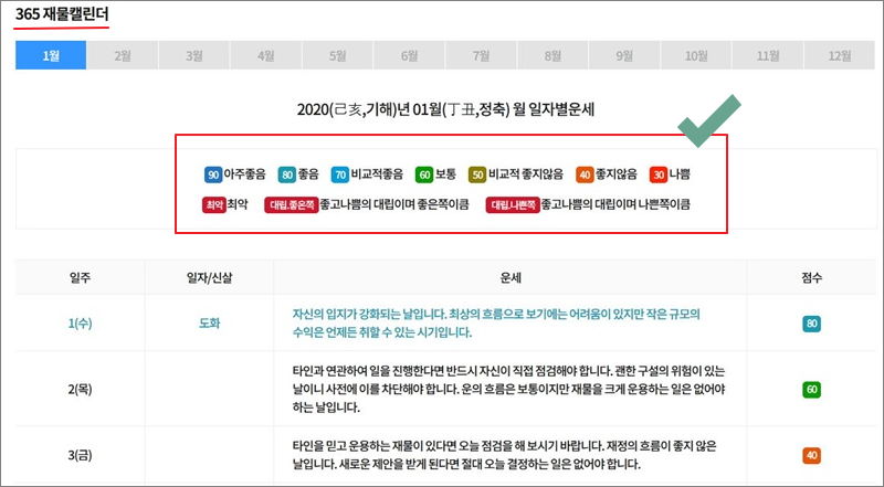 ▼ 온라인 사주를 통해 일자별로도 나의 재물운을 알아볼 수 있습니다. 주식투자를 하거나 로또 복권을 구입을 자주 하는 경우 도움이 될 듯 합니다.