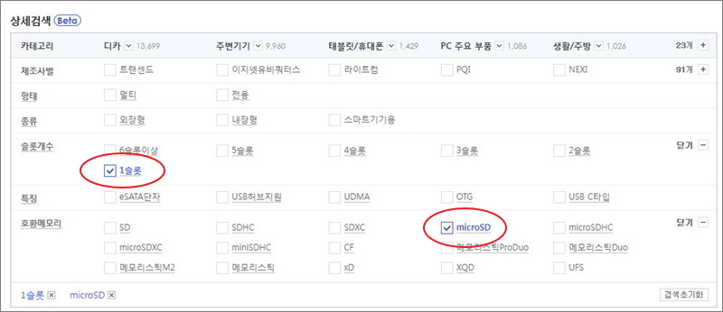 ▼ 검색 결과를 확인하기 전에 화면 상단에 있는 상세검색 기능을 사용해 보겠습니다. sd카드에도 여러 종류가 있듯이 sd카드 리더기 종류도 다양합니다. 대부분의 스마트폰과 닌텐도스위치에 꼽을 수 있는 규격인 microSD 타입을 선택해 보았습니다. 가장 많이 사용하는 1슬롯으로 말이죠.