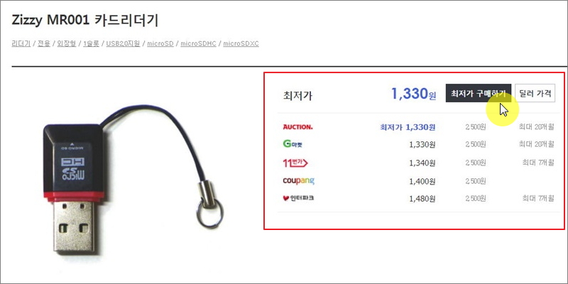 ▼ 저렴하면서 많은 사람들이 구매하는 Zizzy MR001 sd카드 리더기를 선택해 보았습니다. 해당 제품을 파는곳이 여러 개 나옵니다. 여기에서 최저가로 파는곳을 선택하면 됩니다. 온라인 구매 특성상 배송비가 발생하기 때문에 2개 이상 구입할 때 이득이 큽니다.