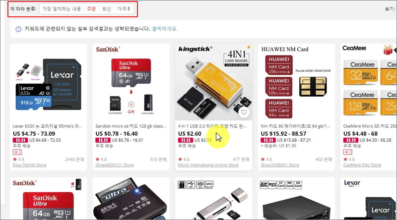 ▼ 요즘에는 알리익스프레스에서 한글로 검색이 가능합니다. sd카드 리더기 제품을 검색해 보았습니다.