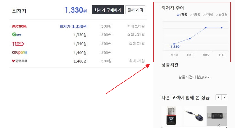 ▼ 리더기에 대한 최저가 추이도 확인이 가능합니다. 최근 1개월에서 12개월 동안 해당 제품의 가격이 어떻게 변했는지 알 수 있습니다. 아무래도 저렴할 때 팔 때 구매하는 것이 좋습니다.