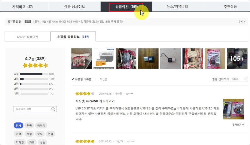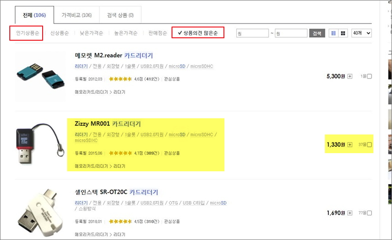 ▼ 일반적으로 많이 구매하는 sd카드 리더기가 검색되었습니다. 저렴하게 파는곳의 경우 천원 초반대의 가격에도 구매가 가능합니다. 검색된 sd카드 리더기 상품의 수가 106개나 되기 때문에 일일이 비교하기는 어렵습니다. 이럴 때에는 리스트 상단에 있는 정렬 기능을 사용하면 편리합니다. 저는 다나와 사이트를 이용할 때 인기상품순과 상품의견 많은순 정렬을 많이 이용합니다.