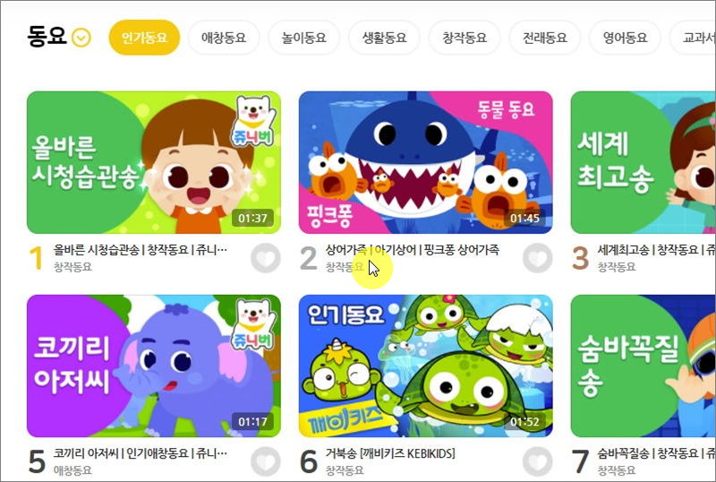 ▼ 인기 있는 동요를 클릭해 보았습니다. 수백 가지 노래모음이 나타납니다. 올바른 시청습관송, 아기상어, 세계 최고송, 숨바꼭질송, 거북송, 코끼리 아저씨 등 아인들이 좋아하는 곡이 많습니다.